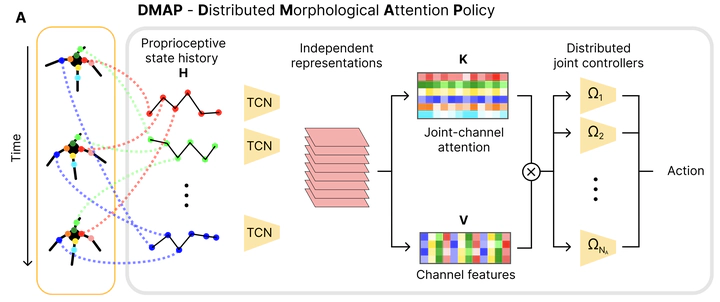 DMAP: a Distributed Morphological Attention Policy for learning to locomote with a changing body